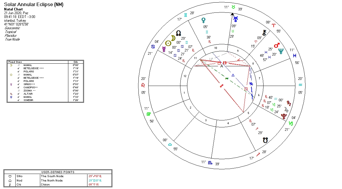 21.06.2020 saat 09.41’de yengeç burcunun sıfır derecesinde halkalı bir Güneş tutulması gerçekleşiyor. Güney Pakistan , Çin ,Kuzey Hindistan ve afrikadan gözlemlenebilecek. Bu güneş tutulmasının süresine bakarak en az 6 ay kadar etkili olacağını söyleyebilirim.