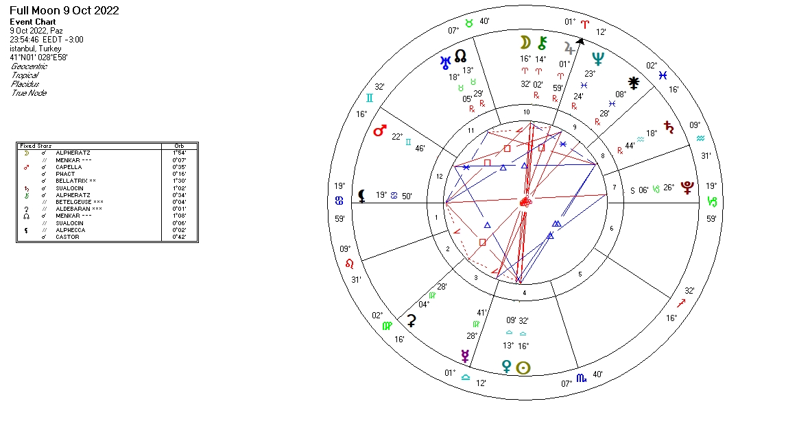 Ay tepe noktada (10.ev) koç burcunda ve alpheratz sabit yıldızı ile birlikte.. Dünya genelinde önemli bir olay beklenir. Kironla da birleşen bu Ay bir kadınla ya da halkla ilgili bir yaraya işaret ediyor. Çok görünür Marsiyen bir olay yaşanacak. Ve bu olay sonucunda güzellikler gelecek. (Chiron koç burcunun bu derecelerinde andromeda kompleksi verir, evliliklerde kurban olmak. Kocanızı ya da karınızı elinden almaya çalışanlar olabilir , evliliğinize nifak sokmaya çalışanlar.. DİKKAT! Evlilikte çevrendeki insanlardan zarar ve yara alabilirsin diyor , dolunay! )