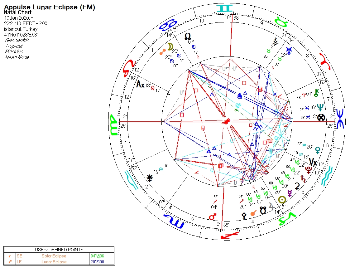 10 ocak 2020 de Satürn hem Tutulmaya sert açı yapıyor hemde dönüşüm gezegeni Plüton ile kavuşum yapmakta. Satürn - Plüton kavuşumundan size yukarda zaten bahsetmiştim. Tüm bunlar dünya genelinde Ekonomi ve Devletle ilgili sorunların meydana gelebileceğini gösteriyor. Ayni zamanda temeli saglam olmayan birlikteliklerde ayrilik ile sonuclanabilir. Önemli Devlet adamlarının veya Yöneticilerin istifaları gündeme bomba gibi oturabilir. Ayrıca bir Kadın liderinin ölmesi veya öldürülmesi de söz konusu olabilir. Kadim astrologlara göre Yengeç burcunun ücüncü dekanında meydana gelen Ay tutulması, Kadın cinsinde ölümleri, ani yıkımları ve ıstırapları gösterirmiş.