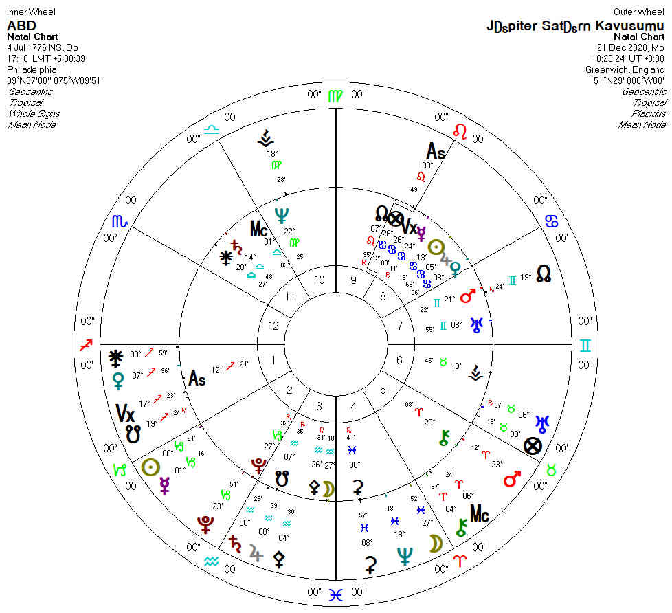 Satürn - Jüpiter kavuşumu Amerika haritasının 3.evinde gerçekleşecek. 3.ev yakın ülke komşuları, eğitim, sosyal medya , ulaşım ve iletişim araçları ile ilgilidir. Bu alanlarda yeniden yapilanma sürecine girilecektir. Aynı zamanda yakın komşu ülkeleriyle de sorunlar ortaya çıkabilir . Transit Uranüs 6.evden bu kavuşuma dik açı yapmakta. Bu olay Amerika ordusunun ani harekete geçmesine işaret edebilir. Ayrıca 2022´lerde Transit Satürn amerika solar arc haritası'nın 7.evinde olucak ve Amerika'nın natal haritasında ayıylak kavuşacak. Dolayısıyla ay haritada 8.ev yöneticisi olduğu için ekonomik sorunlar yasacağını gösteriyor. Halk´in devlete karşı daha çok ses çıkardığı ve ülkede iç kargaşa yaşanabileceğini de düşünüyorum.