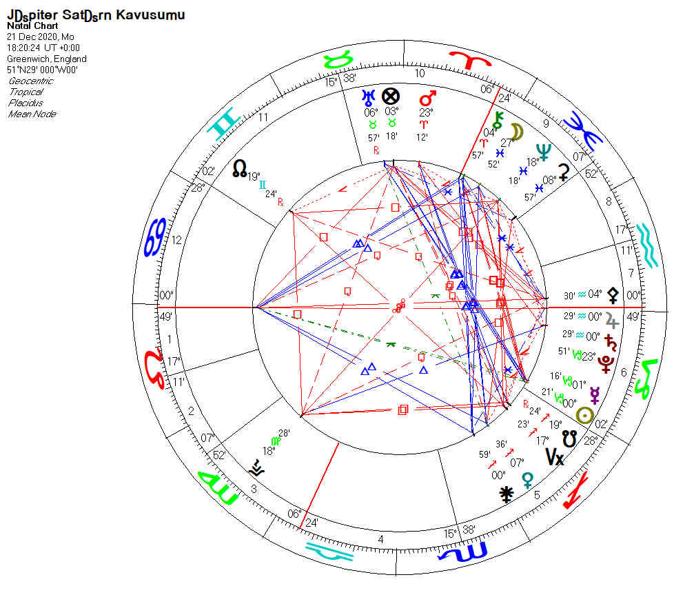 Burada Jüpiter - Satürn kavuşumunun an haritasını görmektesiniz. Haritada önemli olan göstergeler bunlardır :