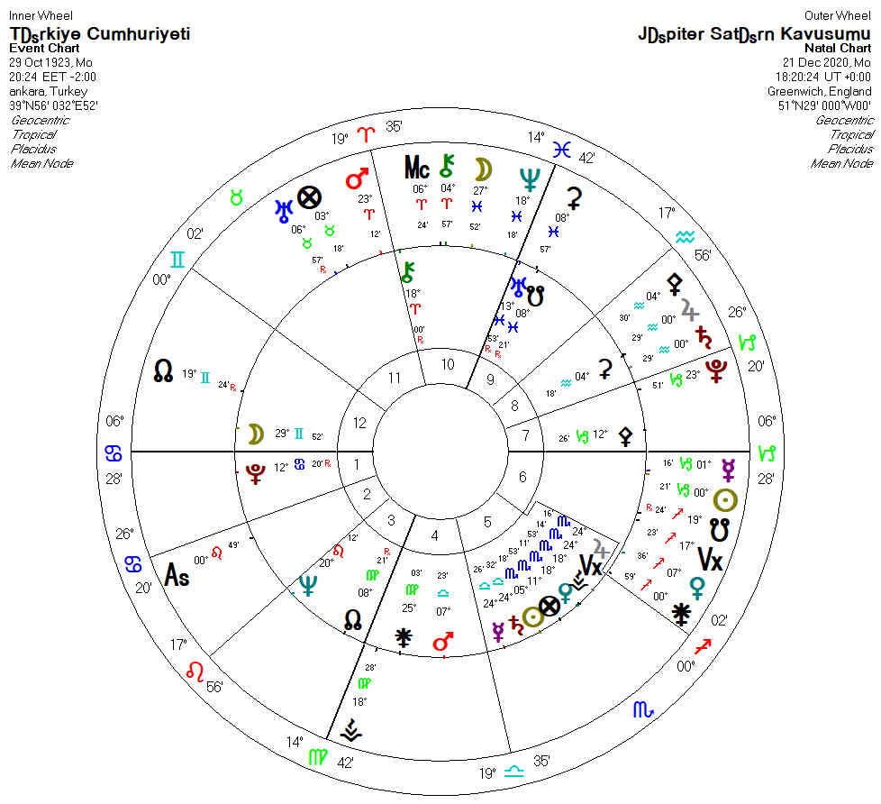Jüpiter - Satürn kavuşumu Türkiye haritasının 8.evine denk gelmektedir. 8.ev kredi, borç, vergi, sigorta ve bankaları temsil etmekte. Dolayısıyla Türkiyede 2020 - 2040 yılları arasında ekonomik kriz, doğal afetler ve kitlesel ölümler ön plana çıkacaktır. Bu kavuşum 5.evde ki Güneşe sert açı yapmakta. Bu kavusum otorite figürlerini, ülkenin önde gelen Sanatçılarını, liderlerini ve devleti zor duruma sokacak olaylar meydana getirebilir.
