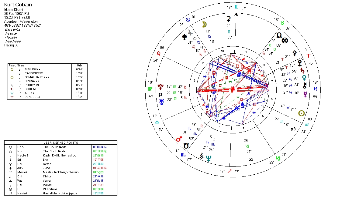 Haritaya ilk bakışta , Cobain’i temsil eden merkür’ün 6.ve 7.evde yerleştiğini görüyoruz. Merkür’ün balık stelyumu ile birleşmesi kişinin hastalıklar ve ilişkiler yoluyla acı çekeceğini ve bunun duygusal yolla dile dökeceğini belirtiyor.