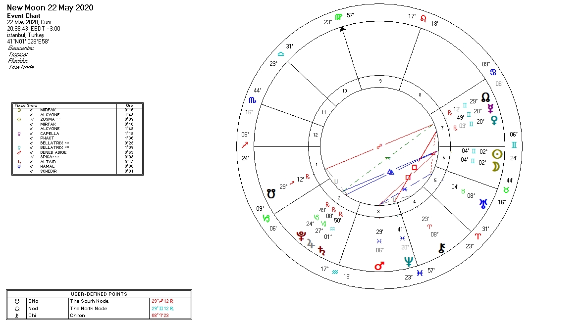 Ne konuştuğumuza ,ne anlattığımıza dikkat edelim olur mu? Kandırma ve kandırılma ihtimalimiz çok yüksek.Ay’ın Satürn ile uyumlu açısı (20.11) gerçekleştikten sonra ikizler burcu yeniayı gerçekleşiyor.(20.38) Ay’ın karanlıkta kaldığı zamanlarda yeni bir şey başlatmamak gerekir. Yeniayın üzerinden en az 1 gün geçmesi hayrımızadır.