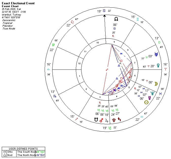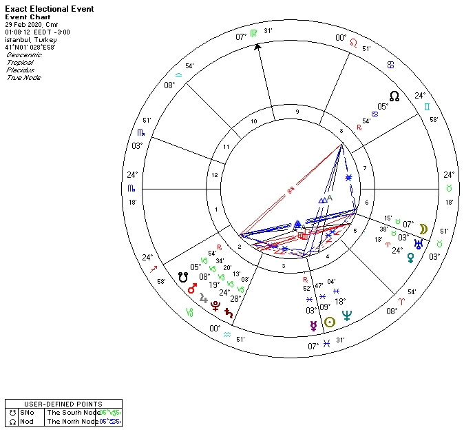 Türkiye haritasının 6 ve 7.evine denk gelen ,Mars ve güney ay düğümü kavuşumu açık düşmanlıklara,askeri harekata ve diğer ülkelerle olan anlaşmazlıklara dikkat çekiyor. Bu süreçte açık düşmanlıklar görülebilir.