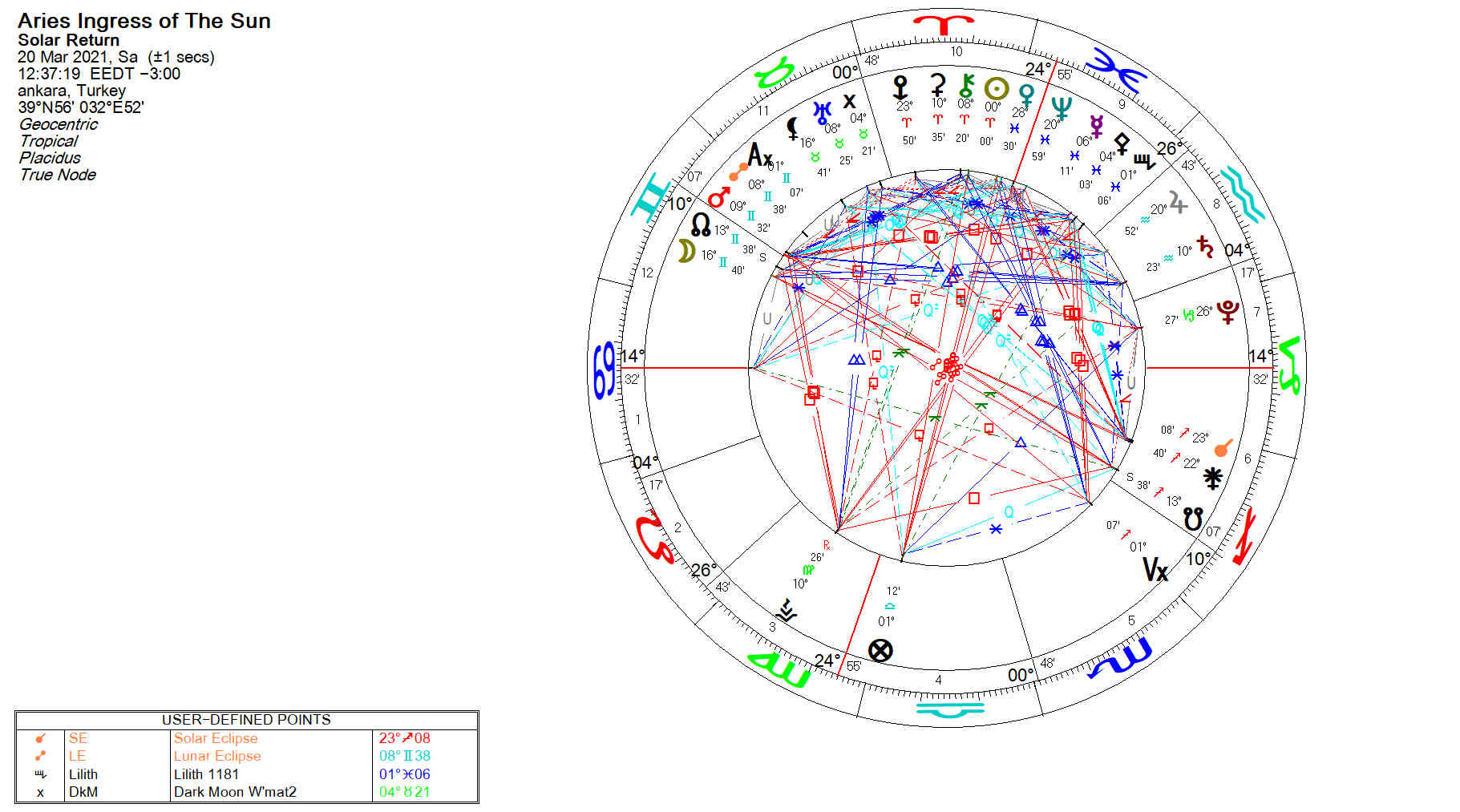 Ay Tutulması Haritasındaki Satürn´e karşıt , Plütona kare açı yaparak T-kare açı kalıbı oluşturuyor. Aynı zamanda Transit Satürn Kironun üzerinde, Transit Plüton natal Güneşe karşıt ve ay düğümleri ters kavuşumda... Gerçekten saldırı veya suikast gibi durumlar söz konusu olabilir.