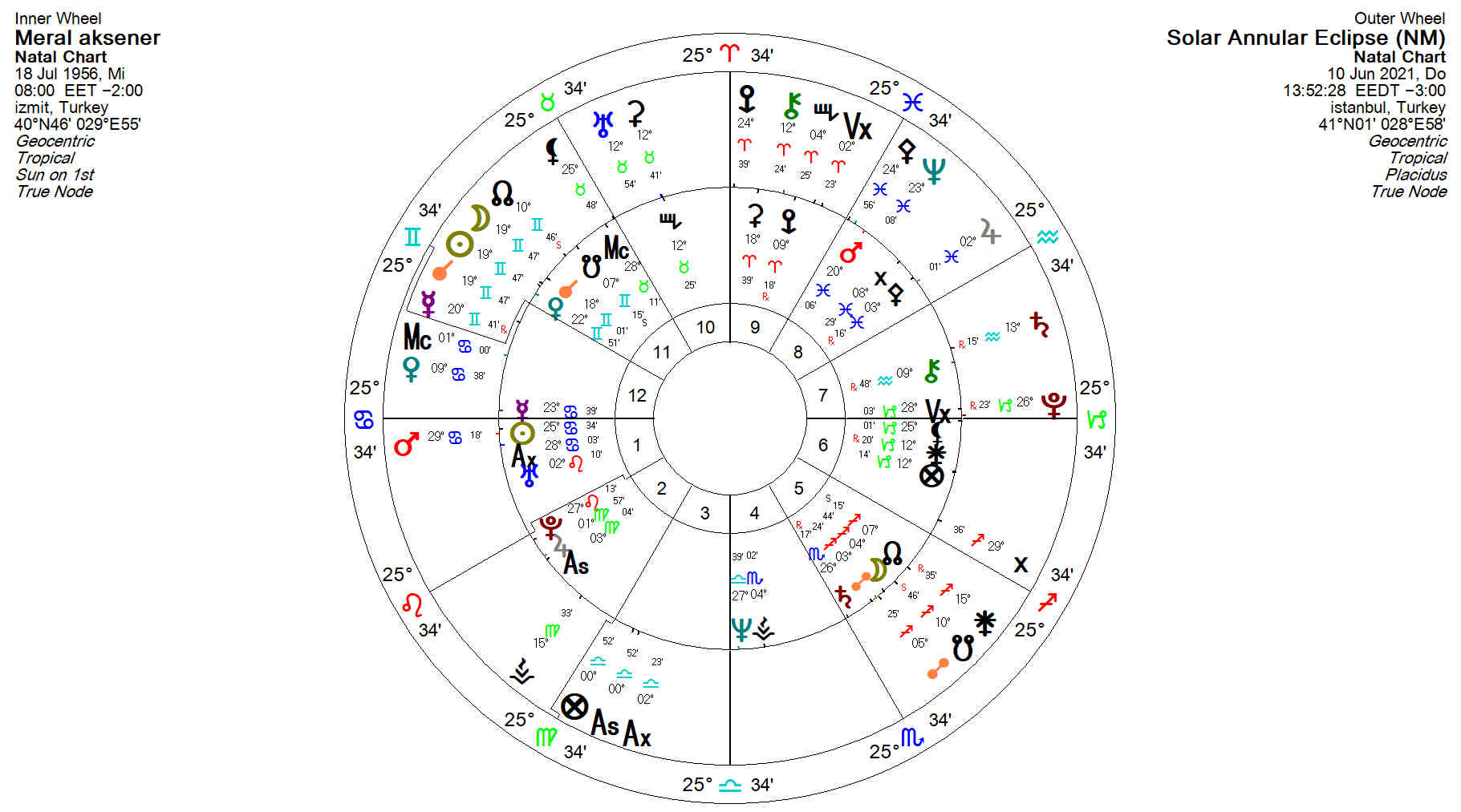 Tutulma Venüs gezegenin üzerinde meydana geliyor. Venüs´ün üzerinde olması bir ortaklığa ve iş birliğine işaret edebilir. Ancak Tutulma haritadaki Mars´a sert bir açı yapıyor ve Transit Neptün´de Marsın üzerinde bulunuyor. Transit Mars - Plüton karşıtlığı, Meral hanımın Güneşini etkilemekte. Ayrıca Eylül başında Transit Gad Ay'ı ile kavuşum yapacak. Tüm bunlar bir saldırıya açık olduğunuda gösteriyor... Bu Tutulma 30 Ağustos´da tetiklenecek. Dolayısıyla bu dönem risk olarak daha fazla ön plana çıkmakta.