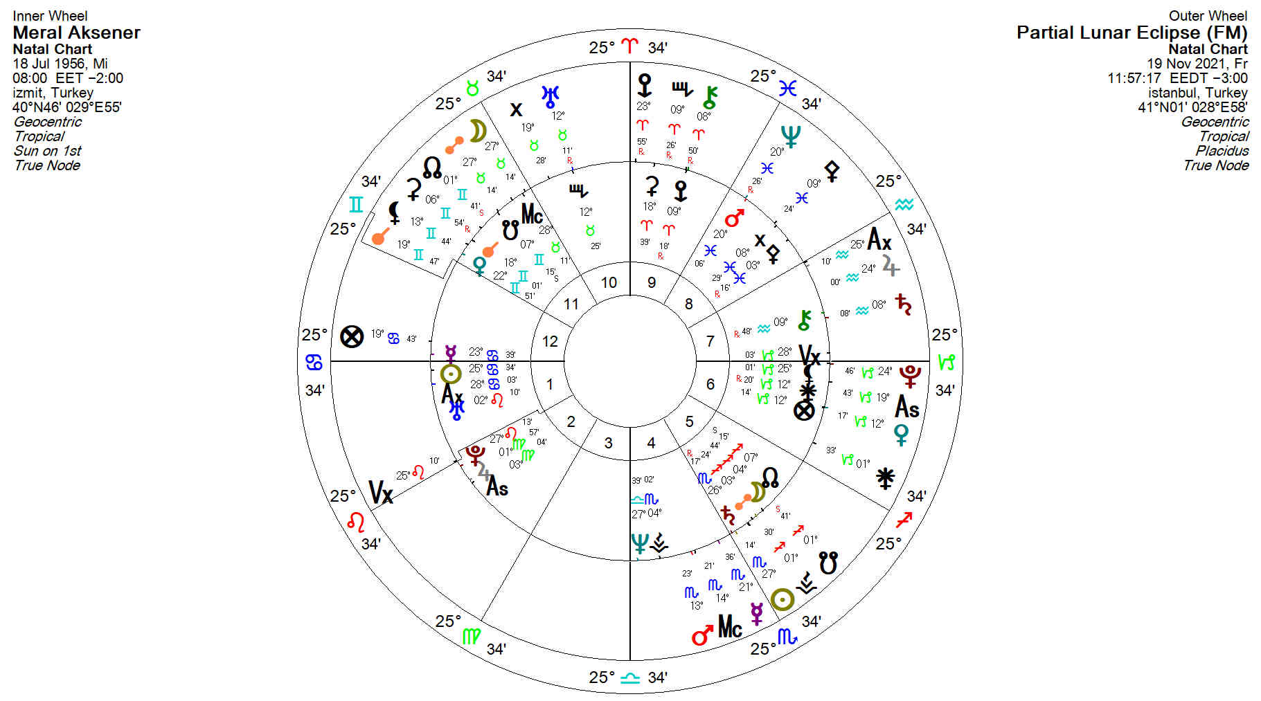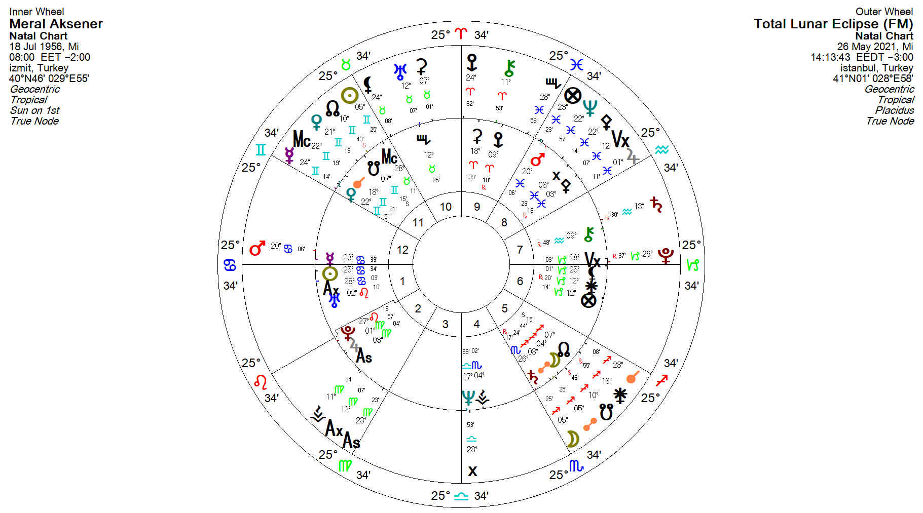 26 Mayıs 2021´de Yay burcunda bir Ay Tutulması meydana gelecek. Bu Ay Tutulması haritada Ay/Kad Kavuşumun üstünde gerçekleşecek. Aynı zamanda Transit Jüpiter haritadaki Natal Jüpitere karşıt açı yapmakta ve ay düğümleri ters kavuşumda bulunuyor. Dolayısıyla hepsi Meral hanımın bu dönem ön plana çıkabileceğine işaret etmekte.
